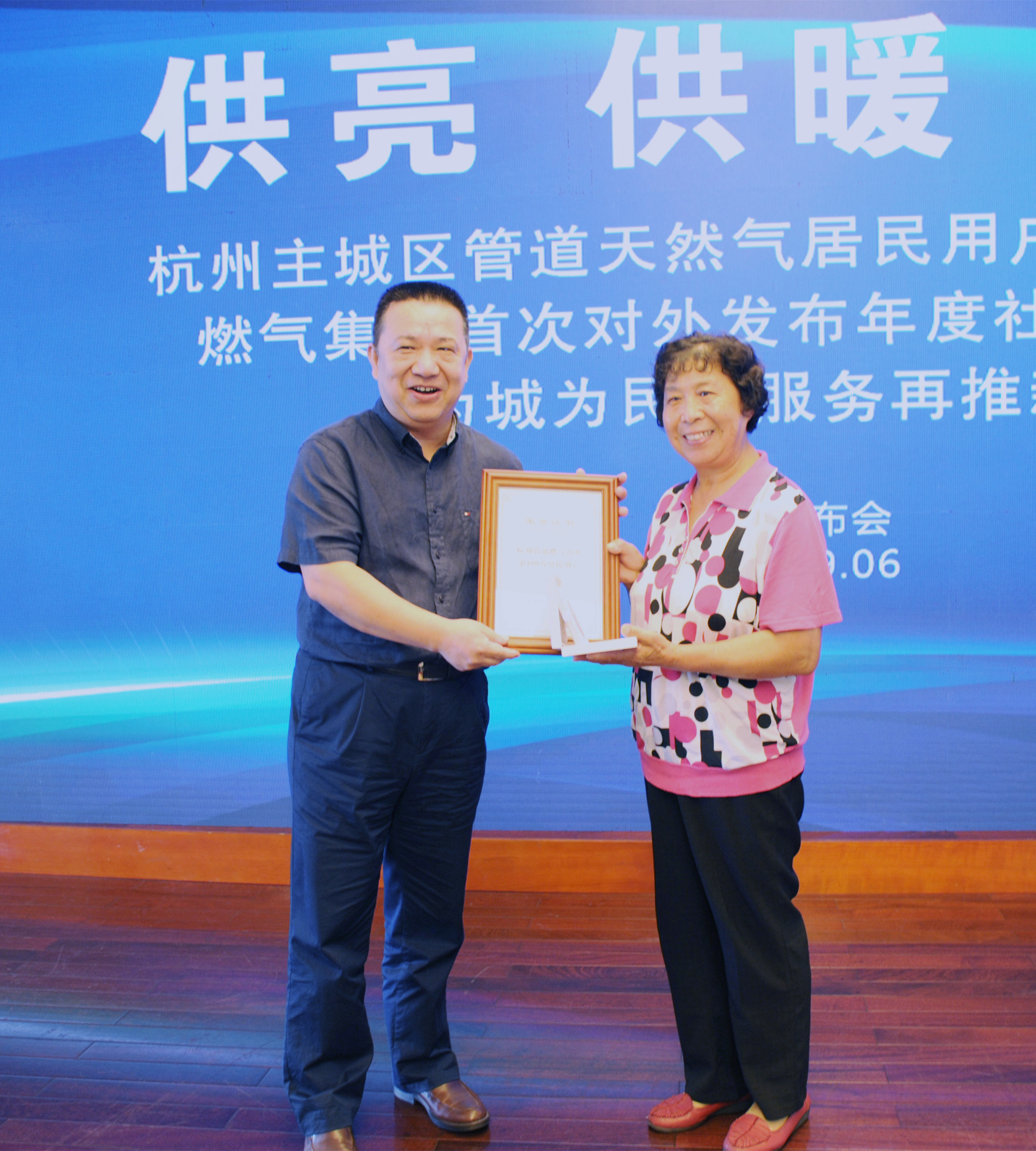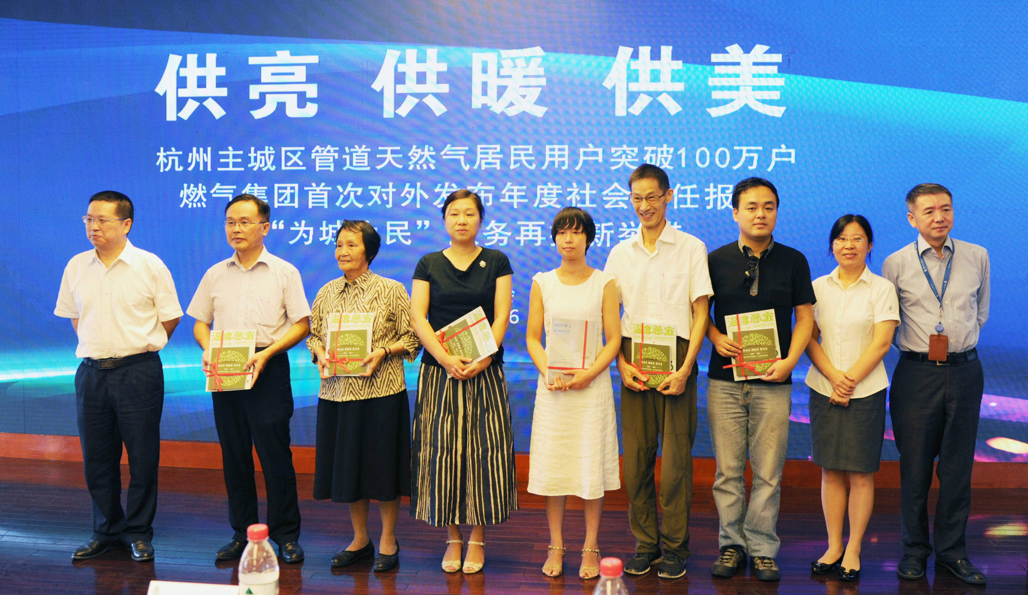 發(fā)布會現(xiàn)場,還播放了第1戶管道氣用戶及第100萬戶管道天然氣用戶采訪視頻,蘆俊董事長為第100萬戶用戶頒發(fā)紀(jì)念品并贈送杭燃優(yōu)家產(chǎn)品。集團(tuán)公司王忠平、朱琴君副總經(jīng)理,杭天公司沈劍平總經(jīng)理向市民代表及品質(zhì)監(jiān)督員贈送《社會責(zé)任報告》、《溫度管家》。