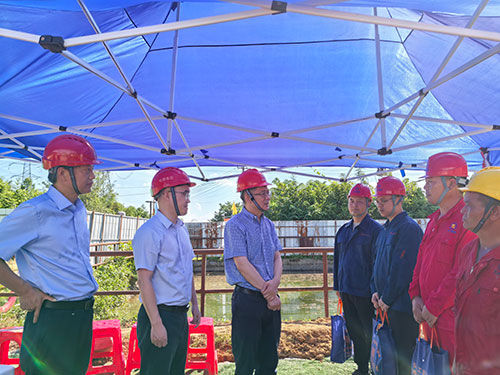 在項目現(xiàn)場,張海華副總詳細了解工程進展與難點,重點關注滯洪區(qū)堤防問題及施工許可證辦理進度,并與一線員工親切交流,詢問施工環(huán)境與防暑措施落實情況,隨后向現(xiàn)場人員發(fā)放高溫慰問品,傳遞集團關懷。