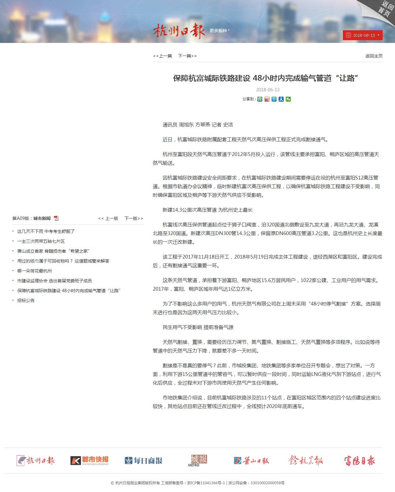 近日,杭富城際鐵路附屬配套工程天然氣次高壓保供工程正式完成割接通氣。