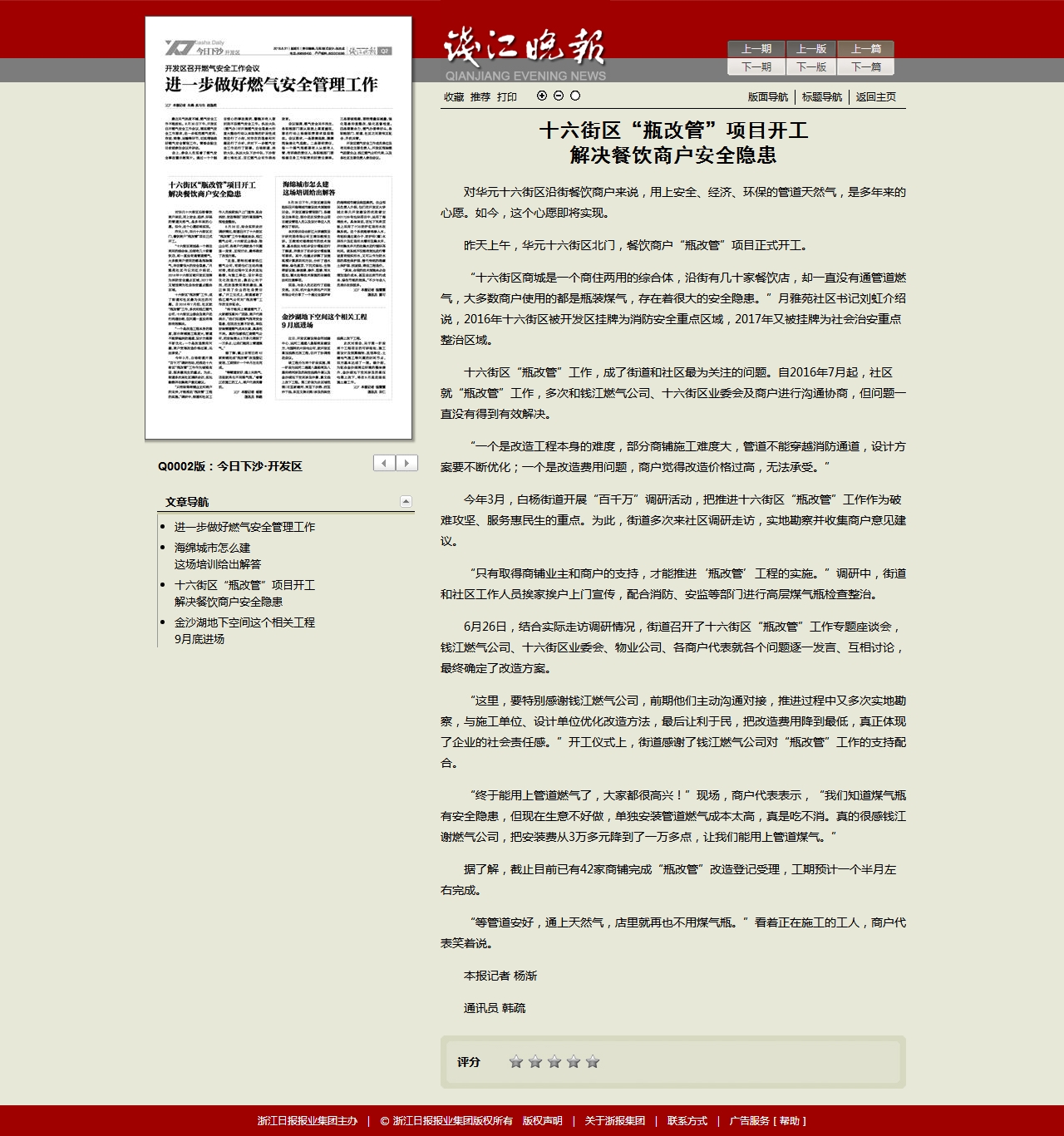 “這里,要特別感謝錢江燃氣公司,前期他們主動溝通對接,推進過程中又多次實地勘察,與施工單位、設計單位優(yōu)化改造方法,最后讓利于民,把改造費用降到最低,真正體現(xiàn)了企業(yè)的社會責任感。”開工儀式上,街道感謝了錢江燃氣公司對“瓶改管”工作的支持配合。