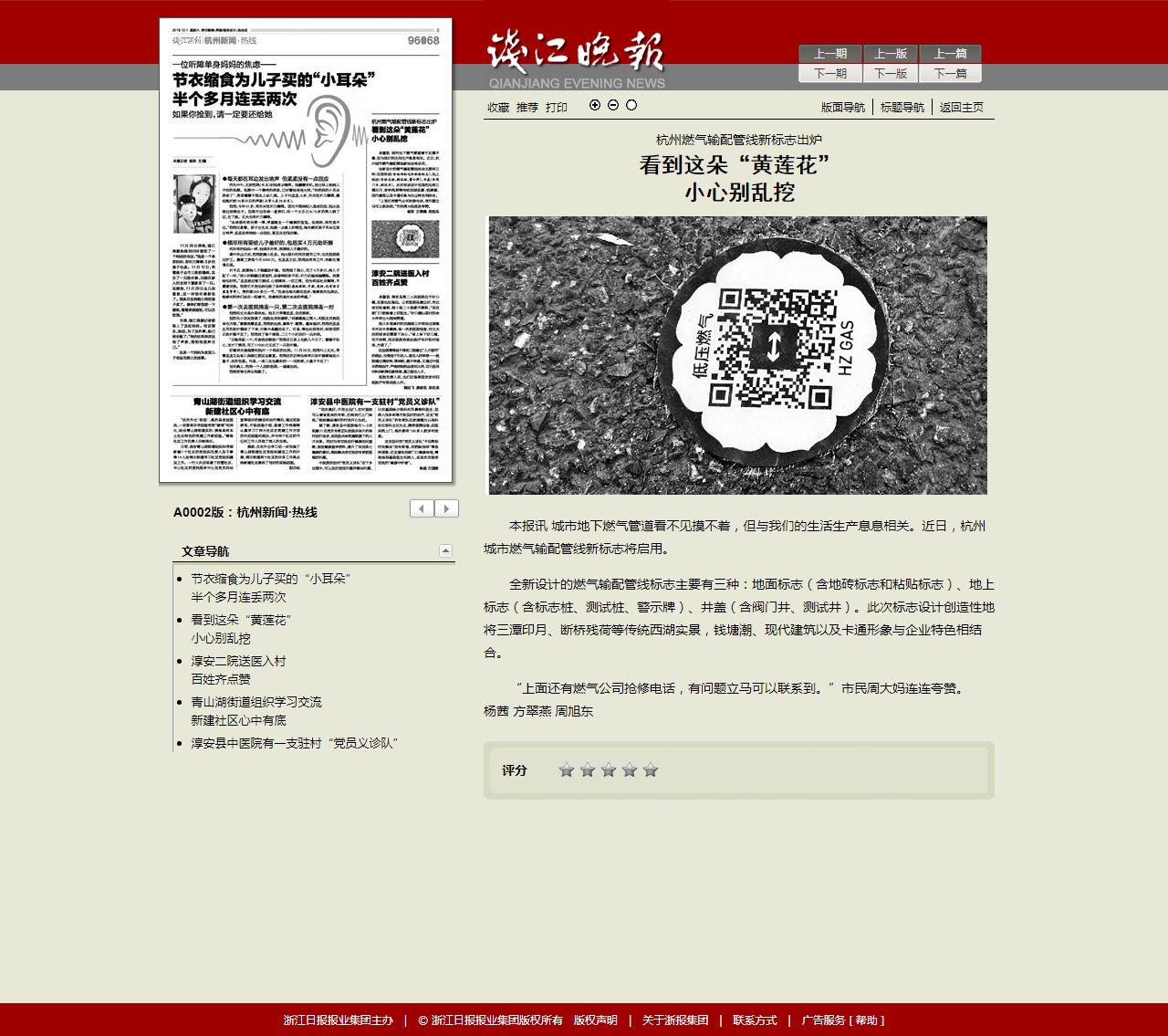 本報(bào)訊 城市地下燃?xì)夤艿揽床灰娒恢,但與我們的生活生產(chǎn)息息相關(guān)。近日,杭州城市燃?xì)廨斉涔芫新標(biāo)志將啟用。