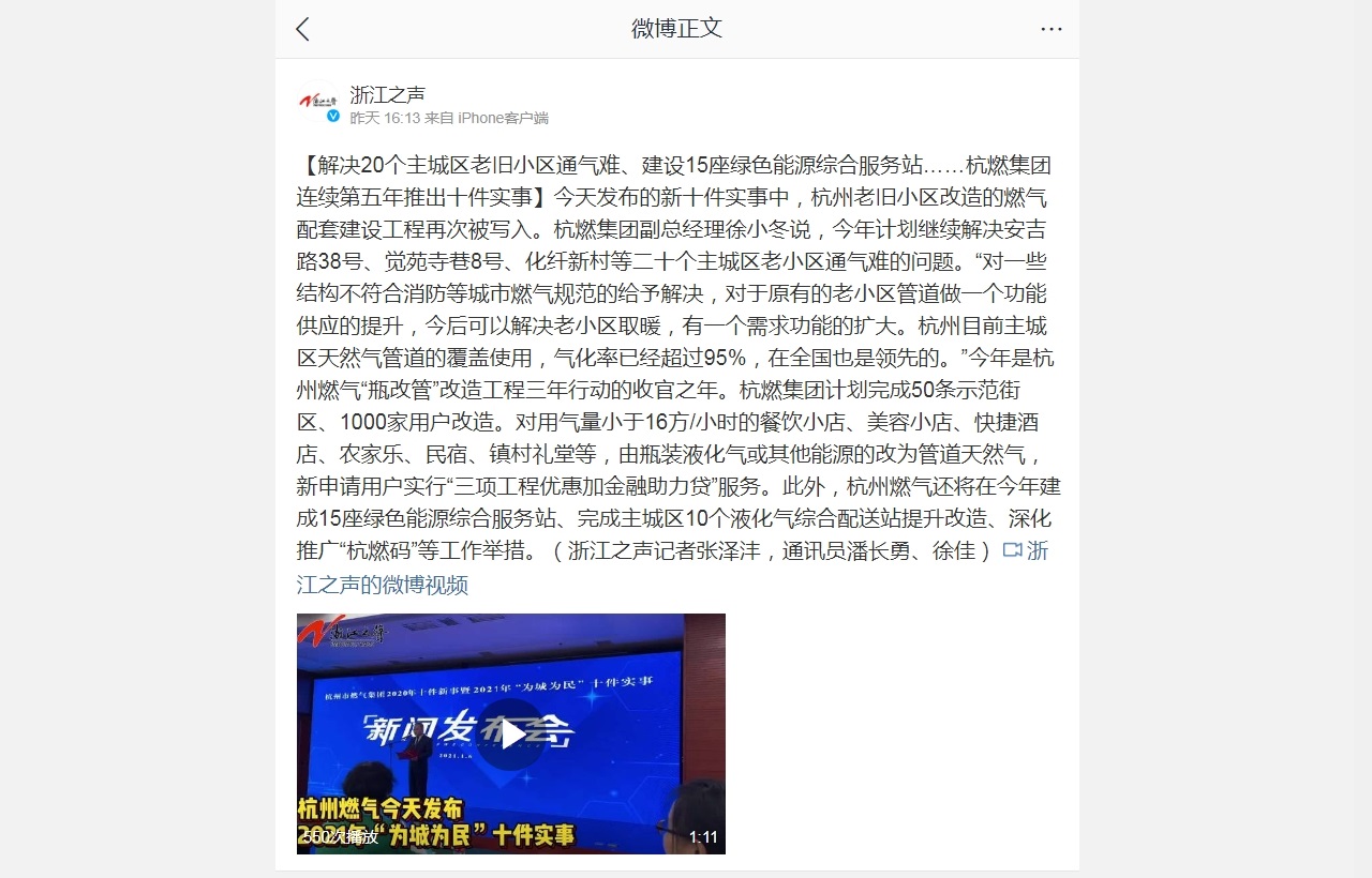 今天發(fā)布的新十件實(shí)事中,杭州老舊小區(qū)改造的燃?xì)馀涮捉ㄔO(shè)工程再次被寫入。杭燃集團(tuán)副總經(jīng)理徐小冬說,今年計(jì)劃繼續(xù)解決安吉路38號(hào)、覺苑寺巷8號(hào)、化纖新村等二十個(gè)主城區(qū)老小區(qū)通氣難的問題!皩(duì)一些結(jié)構(gòu)不符合消防等城市燃?xì)庖?guī)范的給予解決,對(duì)于原有的老小區(qū)管道做一個(gè)功能供應(yīng)的提升,今后可以解決老小區(qū)取暖,有一個(gè)需求功能的擴(kuò)大。杭州目前主城區(qū)天然氣管道的覆蓋使用,氣化率已經(jīng)超過95%,在全國(guó)也是領(lǐng)先的!苯衲晔呛贾萑?xì)狻捌扛墓堋备脑旃こ倘晷袆?dòng)的收官之年。杭燃集團(tuán)計(jì)劃完成50條示范街區(qū)、1000家用戶改造。對(duì)用氣量小于16方/小時(shí)的餐飲小店、美容小店、快捷酒店、農(nóng)家樂、民宿、鎮(zhèn)村禮堂等,由瓶裝液化氣或其他能源的改為管道天然氣,新申請(qǐng)用戶實(shí)行“三項(xiàng)工程優(yōu)惠加金融助力貸”服務(wù)。此外,杭州燃?xì)膺將在今年建成15座綠色能源綜合服務(wù)站、完成主城區(qū)10個(gè)液化氣綜合配送站提升改造、深化推廣“杭燃碼”等工作舉措。(浙江之聲記者張澤灃,通訊員潘長(zhǎng)勇、徐佳)