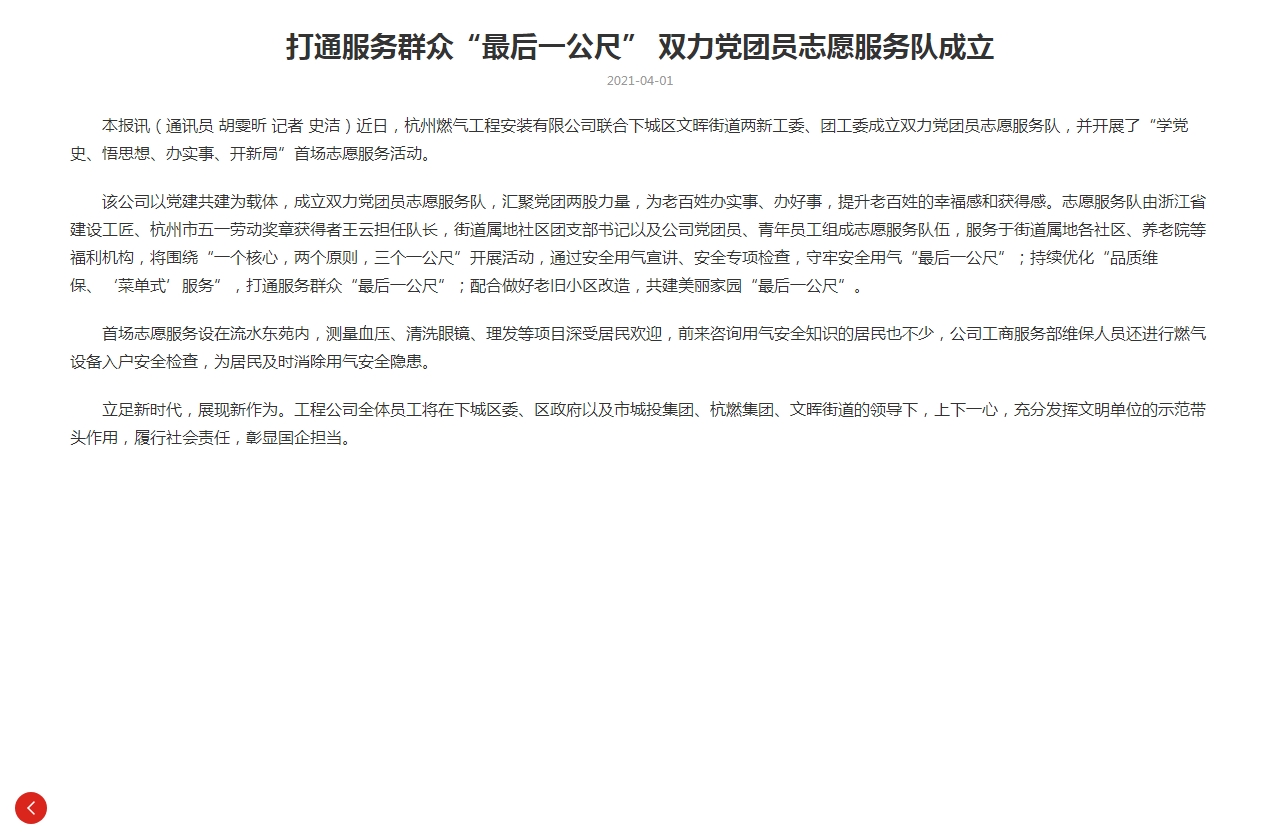 本報訊(通訊員 胡雯昕 記者 史潔)近日,杭州燃氣工程安裝有限公司聯(lián)合下城區(qū)文暉街道兩新工委、團工委成立雙力黨團員志愿服務(wù)隊,并開展了“學黨史、悟思想、辦實事、開新局”首場志愿服務(wù)活動。